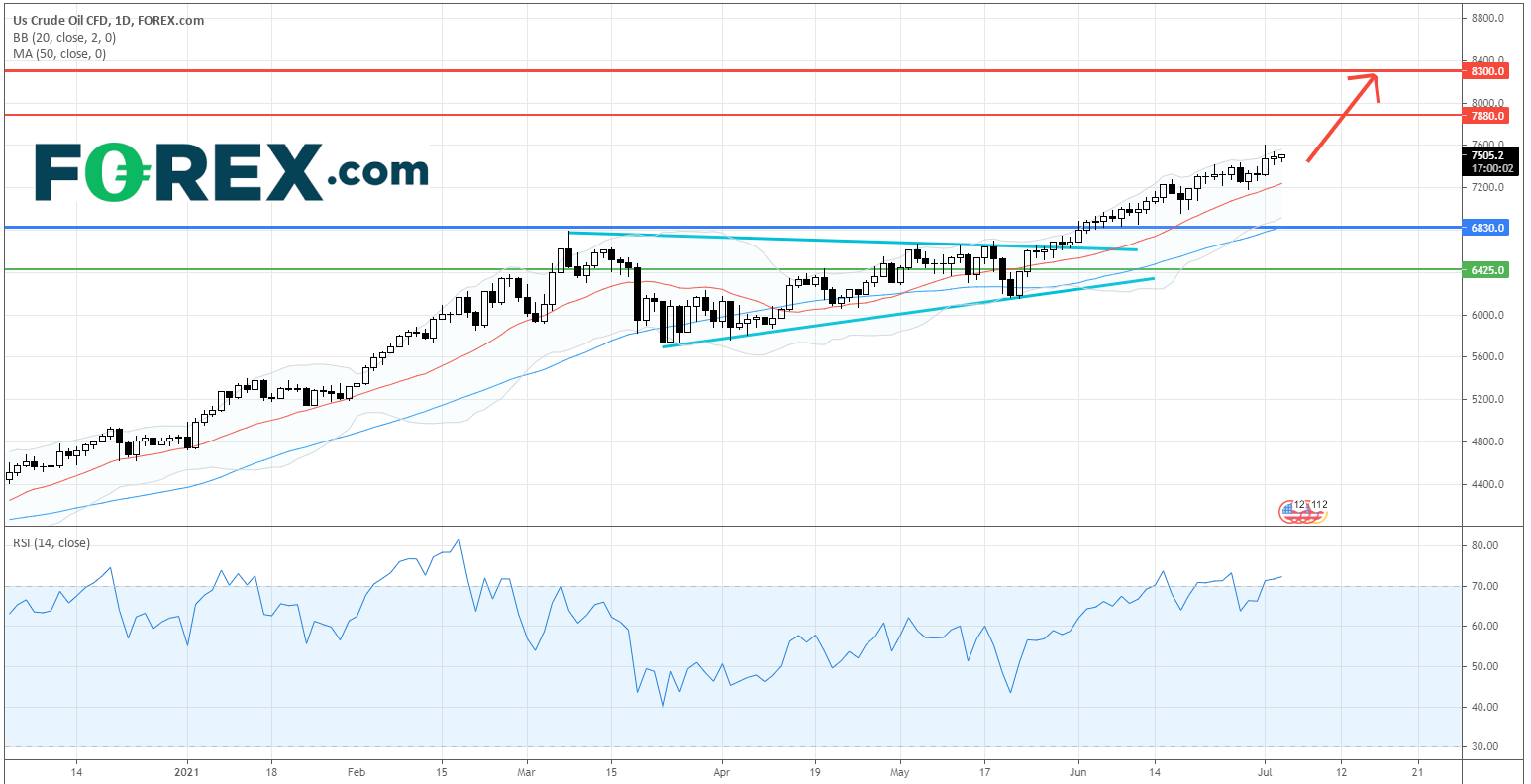 在日线图上,美国原油CFD在突破整固区间后保持上行,并在上行的20日均线之上操作。相对强弱指数仍处于超买水平,表示上行动力强劲。