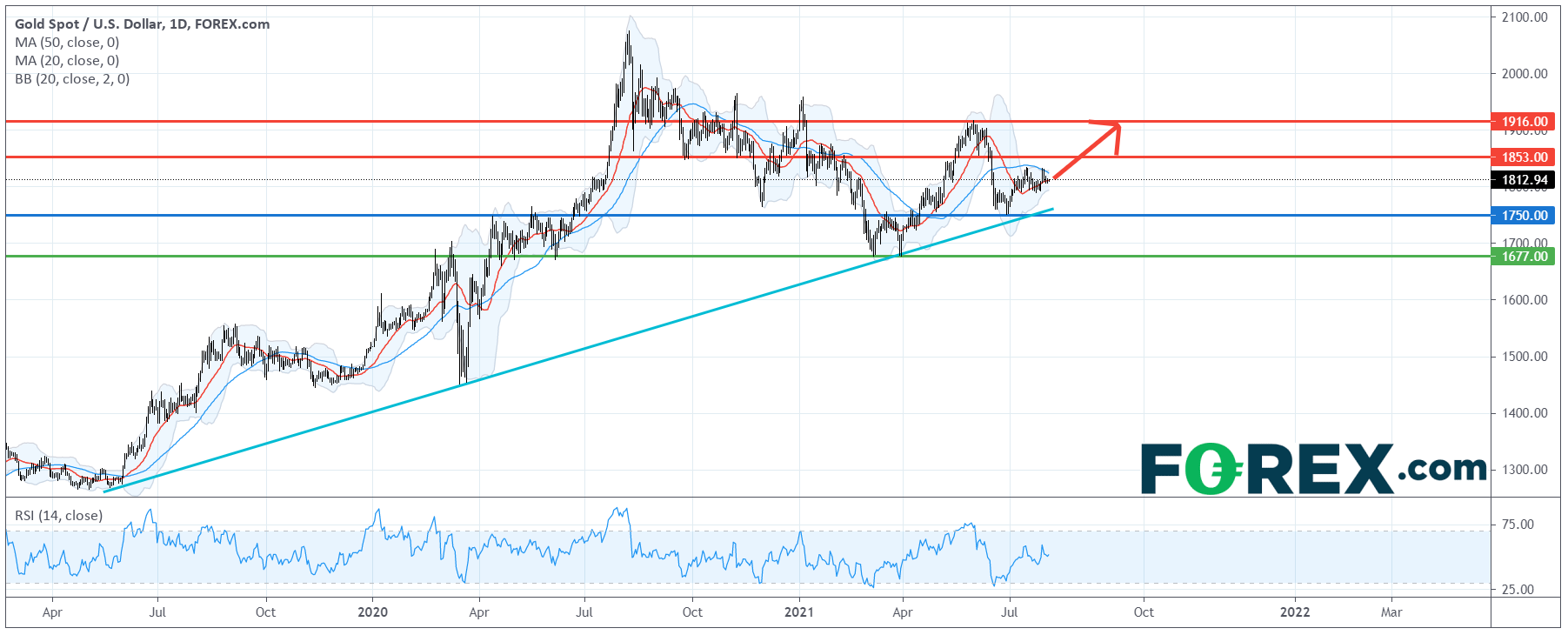 只要主要支持(止损)位1,750美元不破,价格可望挑战上方目标1,853美元及1,916美元。