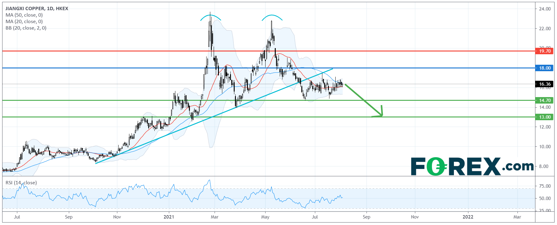 从技术角度看,如日线图所示,江西铜业股价的下行风险正在增加。此前,它形成了一个双顶型态,并已跌破去年10月以来的上升趋势线。