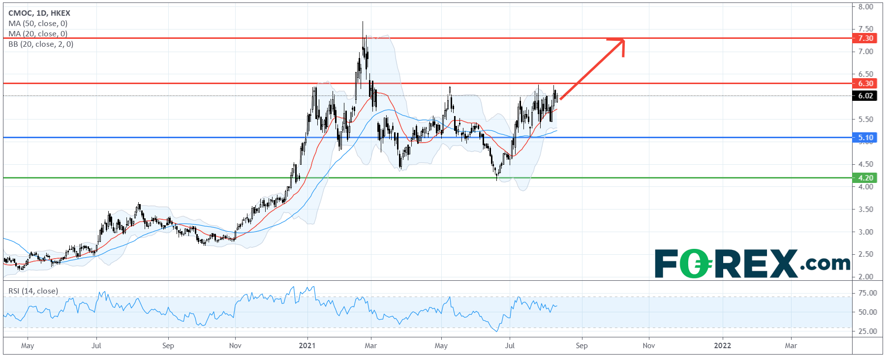 从技术角度看,如日线图所示,洛阳钼业股价仍在一个大型盘整区内交投。目前,它正在测试盘整区的顶部,20日及50日移动均线提供支撑。