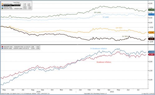 美国5年期和10年期债券收益率与盈亏平衡通胀曲线图