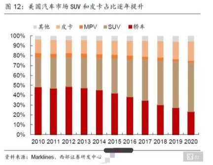 电动车发展初期是一个非常依赖政策的行业,欧洲的高额补贴以及严格的碳排放罚款成为了推动欧洲新能源车腾飞的重要助力。然而在上一个四年,美国的新能源车政策出现了一个巨大的“空档期”,导致需求不足的情况下车企产品投放也不积极;同时美国汽车市场自身的特性,也使得大众对于新能源车似乎并不太感冒。根据Marklines的数据,美国汽车市场主要以SUV和皮卡这样的大车型为主,2020年SUV和皮卡的占比分别达到50%和20%,2020年美国车型销量前三名都是皮卡,足见其受欢迎程度。