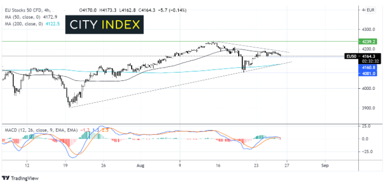 只有失守周四低点4160才能带动推低,接下来看向200均线和上升趋势线阻力4120。若下穿,8月19日低点4080进入视野。(来源:嘉盛集团)