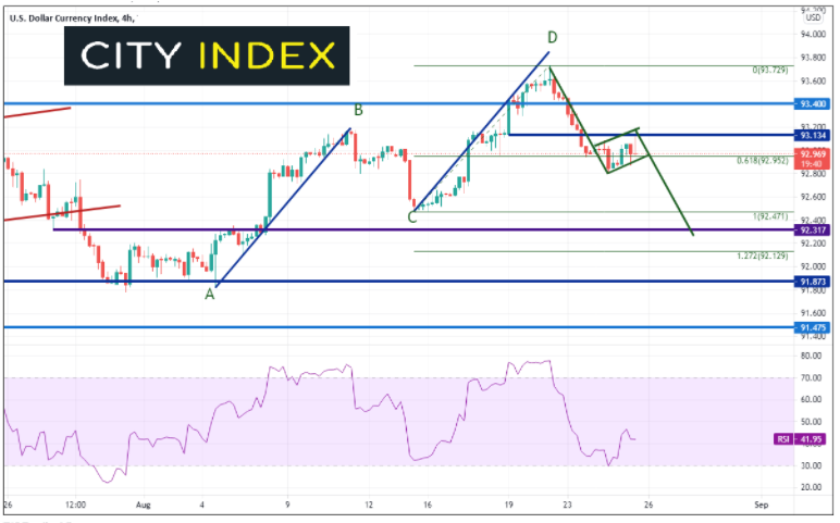 那么,美元指数会继续下跌吗?这个问题很大程度上将取决于美联储主席鲍威尔周五在杰克逊霍尔大会上的讲话。美元指数的回撤已止步于8月13日低点到8月20日高点的61.8%回档位,即92.95附近。技术面看,美元指数似乎可能下跌。如果无法站上93.14,美元指数可能形成旗形形态,目标是突破位加上旗杆长度,即92.25附近。然而,在那之前首先必须击穿旗形底部支撑位92.80和8月13日低点92.47。