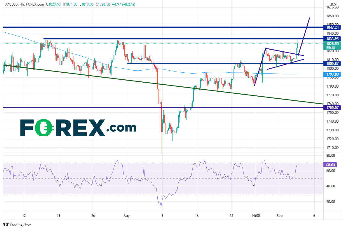 尽管非农疲弱利淡美元,却利好黄金 (XAU/USD)。240分钟图上,金价在数据发布后升穿三角旗高点。旗形目标位在1857附近,但价格必须先拿下强劲水平阻力1834,然后再上穿1847.25。支撑位在1818附近旗形顶部趋势线,然后是1805附近底部趋势线和水平支撑位。