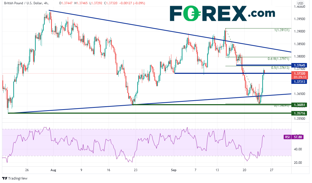 英镑/美元4小时图上反击9月14日高点到周三低点行情的50%回档位兼水平阻力位1.3761/1.3764构成的第一阻力,再往上的阻力在50天均线1.3785和前述行情的61.8%回档位1.3797,以及多个价位,最后是下降的较长期通道所在的1.3830附近。对称三角形通常沿着形成三角形之前的趋势前进。交易者也应当关注,在强硬FOMC声明下美元指数可能无法持续下跌。所以,交易者可能预测英镑/美元下跌。如是,则下档支撑位先后在周三低点兼水平支撑位1.3609/1.3605附近,以及另一水平支撑位所在的1.3572附近。
