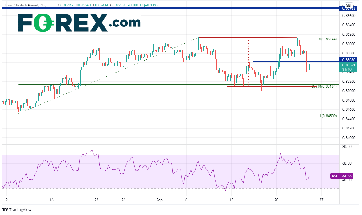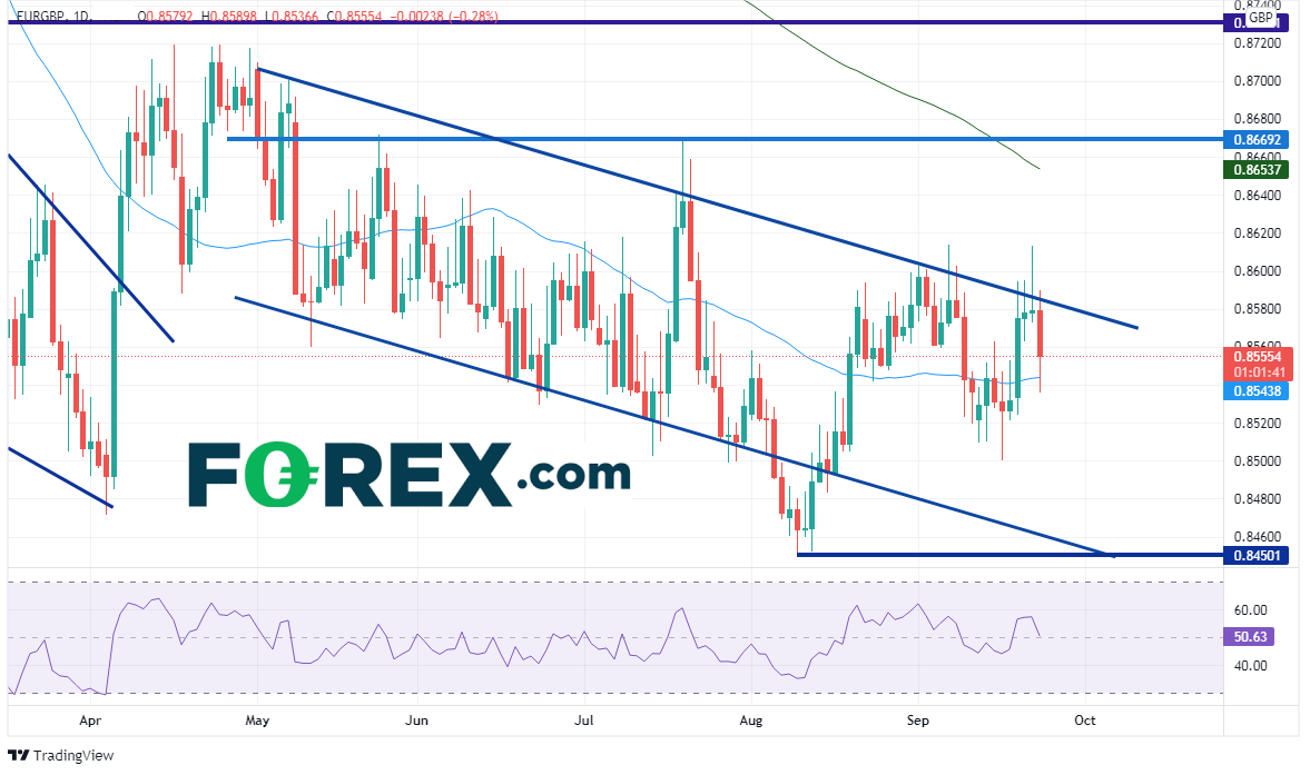 如果价格可以下破该均线,那么8月10日低点到9月7日高点行情的61.8%回档位就落在下方不远处的0.8513,然而9月16日确实击穿过该位并跌至0.8500。所以,如果价格攻克该位,有可能形成双顶。双顶的目标在0.8408,在那之前的最后一个支撑位在8月10日低点0.8450,那也是长期通道下轨趋势线相汇处。如果价格反弹,盘中阻力在0.8563,接着是周四高点0.8589,然后是前高点0.8614。