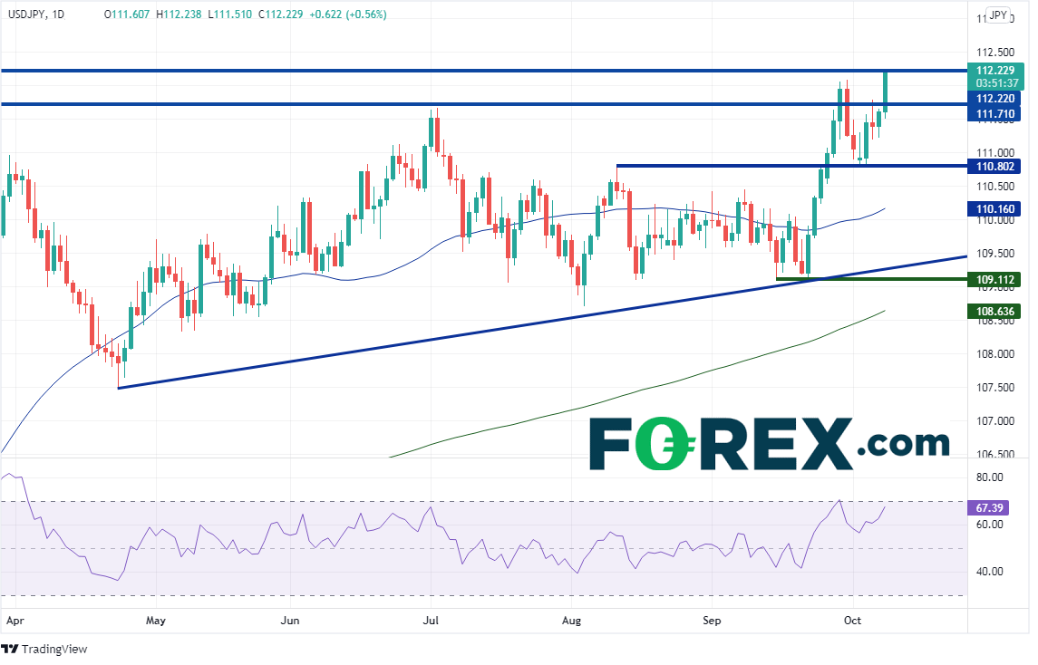 美元/日元通常与10年期美债收益率呈同向走势。今天非农就业数据发布后,收益率开始走高,美元/日元也随之上扬。目前两者相关系数非常之高,达+0.97。随着10年期美债收益率今天突破1.6%(缩表担忧引发债券抛售),美元/日元已升穿112.00,并正测试2020年2月以来高点112.22。7月2日高点至8月4日低点下行之127.2%扩展位在112.16,161.8%扩展位在113.47。然而,请注意RSI正与价格构筑背离,表明美元/日元或做好回调准备。支撑位在7月2日高点111.65附近,然后是8月11日高点110.80。