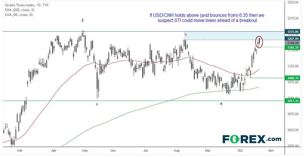 若美元/离岸人民币反弹,STI指数或回落