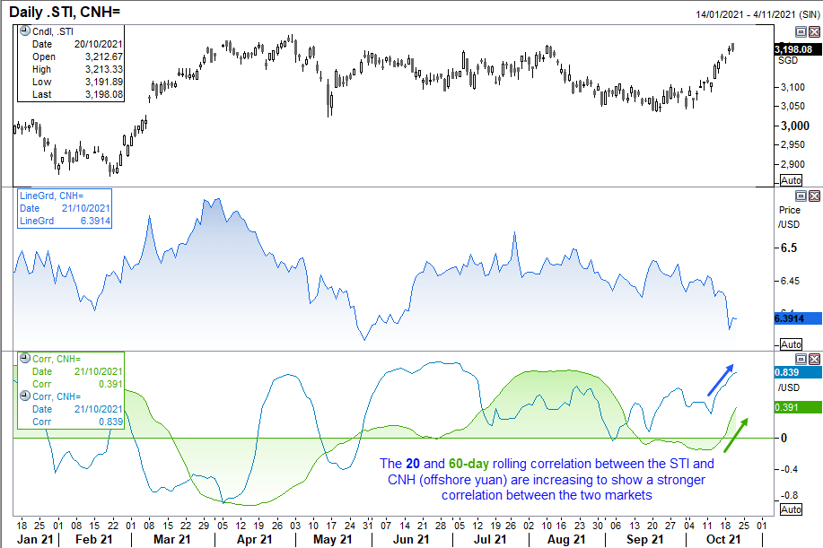 如果我们观察STI和美元/离岸人民币走势,就会发现两者之间存在反向相关性。相关性不算完美,但足以说明较长线相关的存在。若离岸人民币走强(美元/离岸人民币走低),随着离岸人民币资金流涌入,STI指数等亚洲市场获撑。但通过两个市场的相关性指标,我们也注意到1个月(20天)和3个月(60天)动态相关性正在攀升,表明两种资产之间关系最近几周逐渐强化。