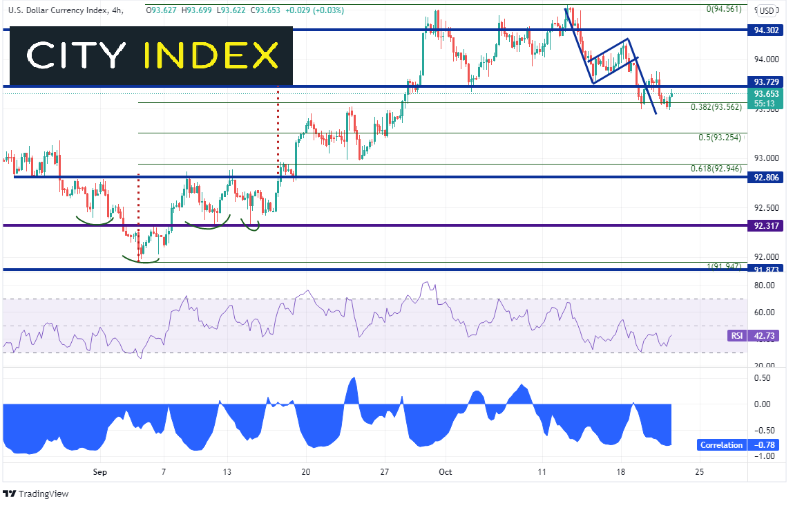 美元指数和标普500指数4小时图上的相关系数为-0.78,可以说处于临界点。如果交易者在交易决策过程中决定在时间周期较短的图表上使用该系数,请一定要辅以大量佐证指标。