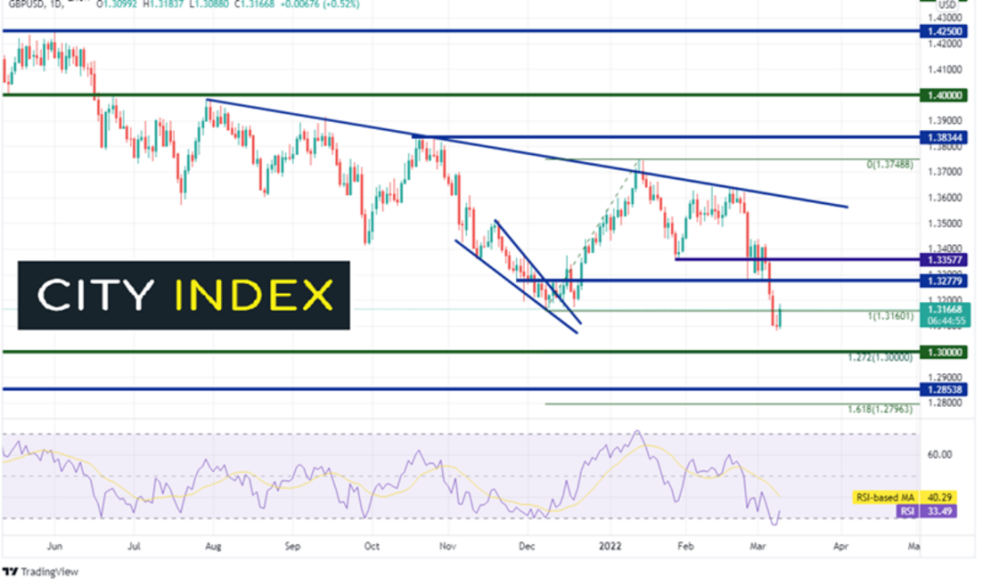 俄罗斯与乌克兰之间的战争出现结束的一线希望,美元因此将自创下2020年5月最高点以来的近期涨幅回吐一部分。美元指数周一测试了2021年5月以来的上斜通道的上轨趋势线、水平阻力位与1月28日高点到2月4日低点行情的161.8%扩展位后触及盘中高点99.42,RSI同样处于超买区域。美元指数今天迄今下跌近1%,回到长期通道内部。