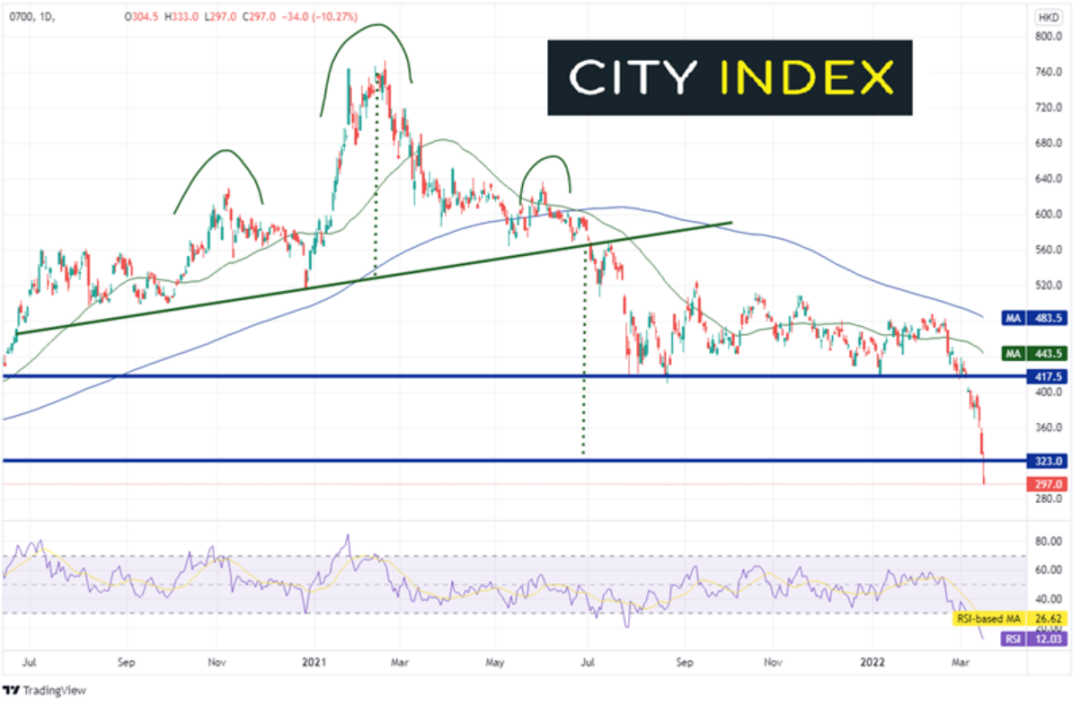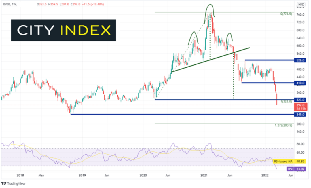 腾讯股价在2021年2月18日创下772.50历史高点,此后不断走弱。2021年5月尝试反击但以失败告终并击穿头肩顶形态的颈线,该形态的目标为颈线下破点加上头部到颈线的高度,本例中在330附近。股价最终于昨天到达前述目标,也跌破由2020年3月低点构成的水平支撑位323。请注意,RSI报在12.03,处于严重超卖状态,暗示价格可能准备回升。
