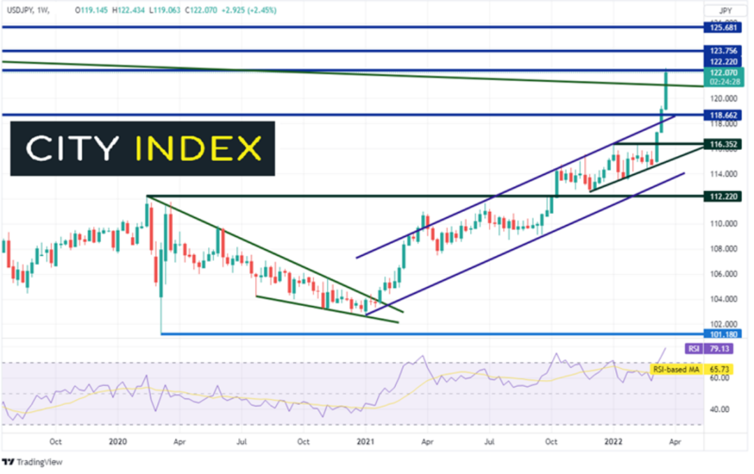 过去三周里美元/日元大涨,涨幅超过6%。该货币对自2021年1月以来从102.59开始有序走高,最高摸至118.66,形成上涨通道,到了3月7日当周,因为美国利率继续上升而加速上扬,两周前站上通道上轨趋势线与水平阻力位,创下6年新高。价格在上周向上突破2002年以来的下降通道(请看绿色部分),之后止步于122.22附近的水平阻力位。上方阻力有水平阻力位123.75和2015年高点125.68。但请注意,RSI处于超买区域,表明价格或准备回撤。下方第一支撑位在长期趋势线的突破位121.00附近,然后是心理整数关口120.00,接着是突破位118.66。