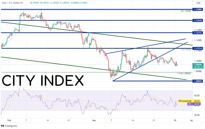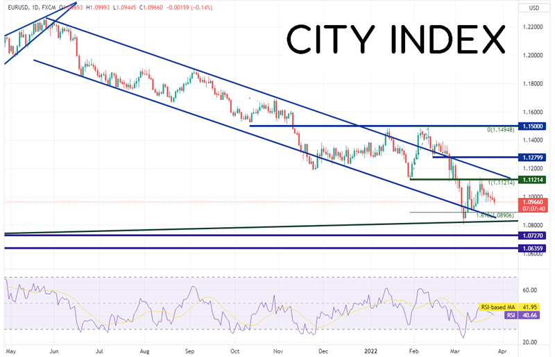欧元/美元2021年5月以来一直交投于一个长期下降通道内,于3月7日考验了2017年1月以来的长期趋势线的支撑位1.0806,其略低于1月28日低点到2月10日高点行情的161.8%扩展位。该货币对随后回升,在3月17日触及3月7日低点1.1121附近构成的阻力,但此后连跌6天。