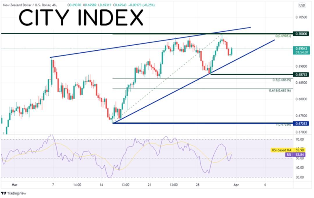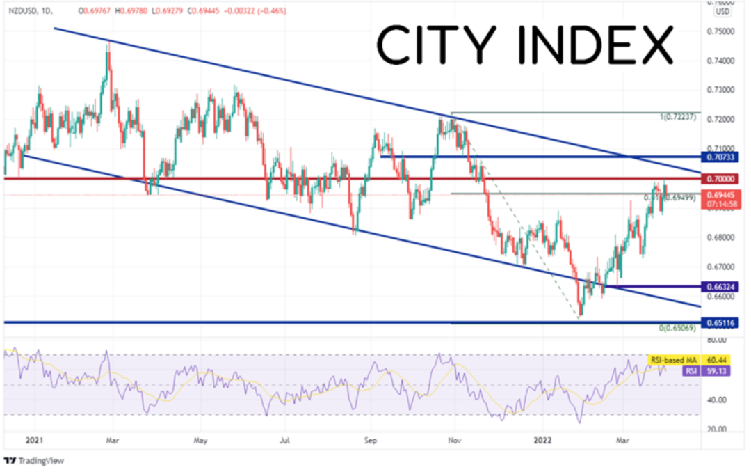 纽元/美元自2021年年初创下0.7465高点以来长期交投于下跌通道内,1月26日假性下破通道下轨,最低跌至0.6507,此后不断走高,目前交投于2021年10月29日高点到1月26日低点行情的61.8%回档位0.6950附近。昨天价格一度摸至0.7000的整数心理阻力关口,今天则回撤。长期通道的上轨趋势线落在0.7045附近之上不远处,构成后市阻力。如果站于其上,可能上看0.7073的水平阻力位,站上后者,则打开上涨空间,目标2021年10月29日高点0.7224。