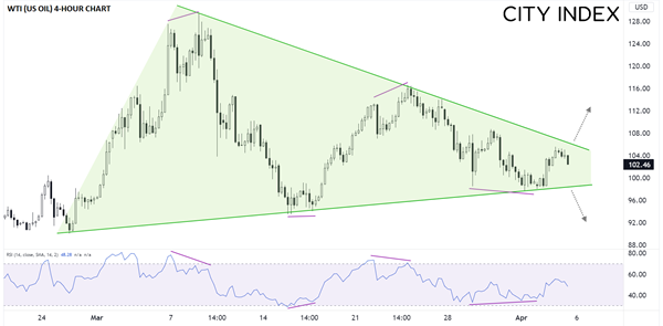 值得注意的是,上述走势的波幅一浪小于一浪,在图表上形成系列下降的高点和上抬的低点。如果转化成传统技术面分析语言,那就是油价在3月明确构筑“对称三角形形态”。提醒不熟悉的读者,对于该形态的一个常见比喻是:从两端向内压迫弹簧后在内部积蓄能量,一旦其中一端压力释放,弹簧(西得州油价)就有可能朝着释放的方向急速波动。