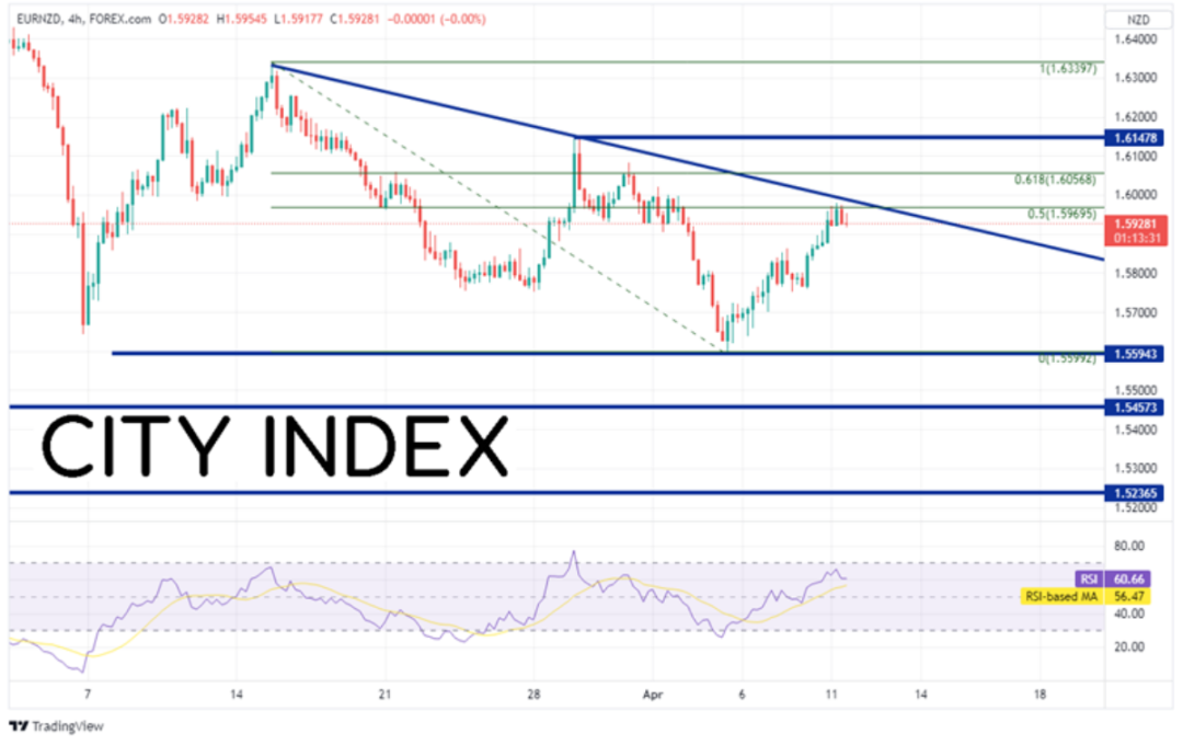 欧元/纽元4小时图脱离最新低点,摸至3月15日高点到4月5日低点行情的50%回档位,即1.5970附近,其略低于三角形的下降趋势线。上方其它阻力位有前述行情的61.8%回档位、水平阻力位1.6148和3月15日以来高点1.6340。下方支撑位有水平支撑位兼4月5日低点1.5600附近、2017年以来低点1.5457 和 1.5237。