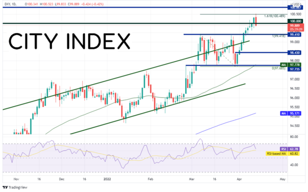 美元以及部分美元货币对和昨天开始下跌的收益率一起回撤。美元指数日图在3月7日高点到3月30日低点行情的161.8%扩展位100.50附近遇阻,今天正在尝试构筑看跌吞噬K线,那是由单根K线形成的反转形态,表现在阴线K线的实体吞没前一天的K线实体。支撑位在向上突破3月7日高点的突破位,即99.42附近。