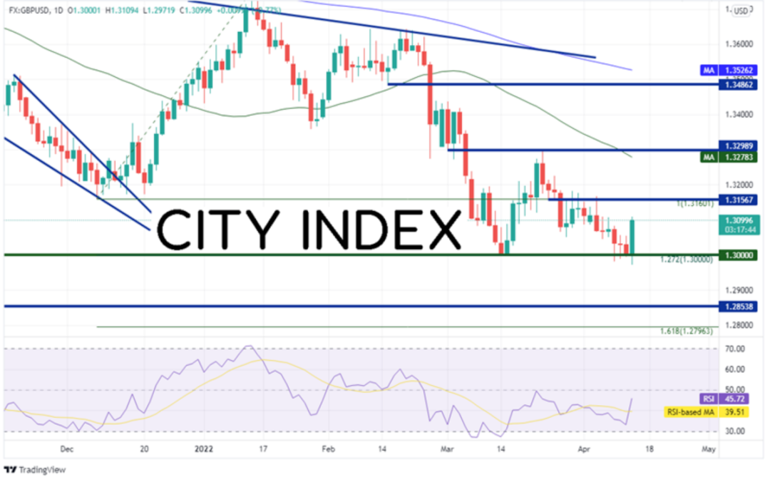 但今天所有美元货币对中走势最引人瞩目的是英镑/美元,其在过去3天一直努力下探,日图跌至2021年12月8日低点到2022年1月13日高点行情的127.2%扩展位兼心理整数支撑关口1.3000,但今天起飞。反弹的主要原因可能是英国3月CPI远高于预期的6.7%,达到7%,也高于2月的6.2%。如果叠加美元走弱,可谓完美风暴。英镑/美元今天在1.2972构筑新低,交投于140点子的区间内,也形成了看涨吞噬K线。水平阻力位在前下破位1.3157附近,如果攻克,上看50天均线1.3278。今天低点下方有一根2020年11月以来的水平支撑位,落在1.2854,如果攻克,可能下探上述行情的161.8%扩展位1.2796。