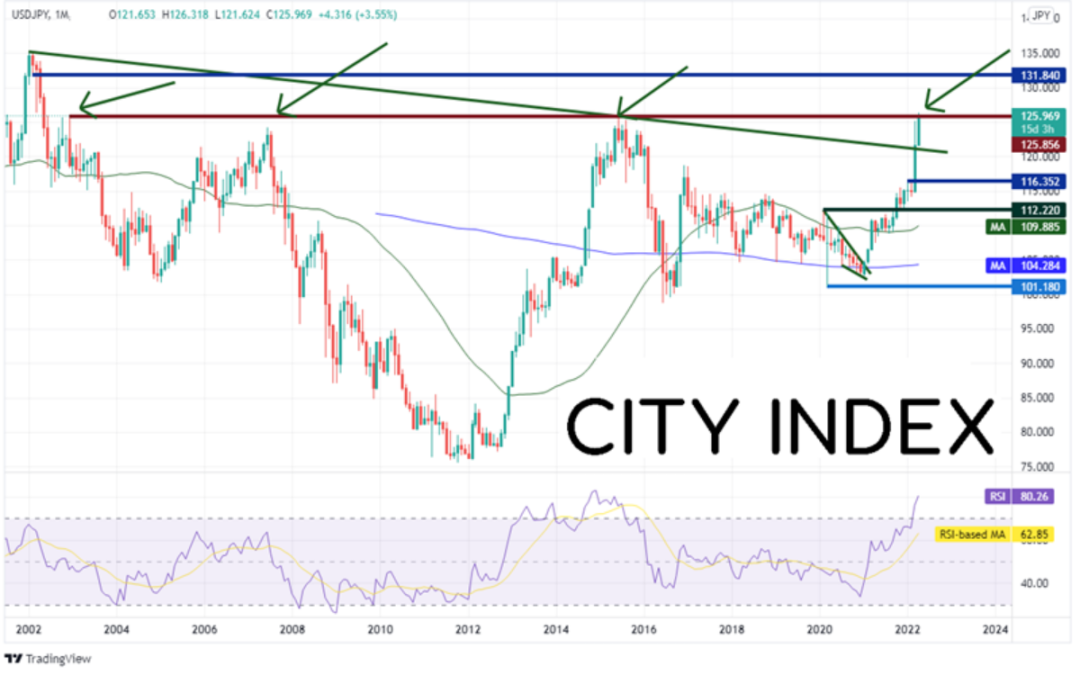 继上月站上2002年1月以来下降趋势线之后,美元/日元本周涨至2002年5月以来最高点,触及126.32。该货币对能够继续上扬吗?当前价位在传统上是日本政府官员开始口头干预,试图推低日元货币对的水平。事实也是如此,过去一周里不少于4位官员已经用各种方式表达这样的态度,即“货币对市场急速波动不受欢迎”、“正警惕地观察日元近期的贬值”。这些言论旨在“口头干预”日元市场,或“用言语”推低日元货币对。日本央行同样有能力进入货币对交易市场,直接买入日元以打压日元货币对水平。美元/日元下个阻力在130.00的心理整数关口,如果攻克,可以上看2002年2月以来水平阻力位131.84附近。但请注意,月图RSI正处于超买区域内,表明价格短线可能回撤。如果确实下跌,则第一支撑位在3月高点125.10,如果失守,可能跌至长期趋势线121.00附近。