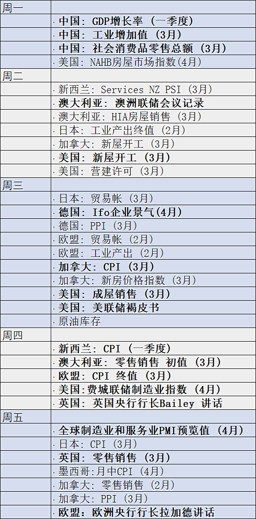 上周的焦点都在各国央行的货币政策决议。新西兰联储和加拿大央行加息50个基点,而欧洲央行按兵不动。但每家央行对应的货币都因央行行动(或无所作为,指欧洲央行)而波动。本周,新西兰、加拿大和欧元区都将发布通胀数据。三个国家的货币将延续上周走势还是会反转?另外,一季度财报季进入高潮,FAANG组合中奈飞将率先发布财报。特斯拉也将披露业绩报告。中国将在周一公布众多数据。中国经济将因为新冠病毒病例的“清零”政策而继续放慢吗?