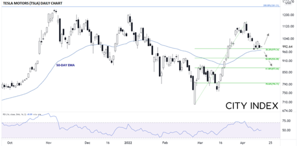 此文发稿时,股价呈现在1000附近企稳的信号,且近期反弹行情的38.2%回档位980和50天指数移动均线970附近构成支撑。如果一季度财报好于预期,多头或利用当前支撑位,借势上攻4月初高点1100区域。而如果业绩令人失望,股价或击穿900一线上轨支撑,扫清扩大下行的障碍。届时这只受欢迎的股票的价格,或先后下探近期反弹行情的50%回档位925附近和61.8%回档位875。
