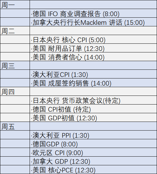 本周将要发布的主要经济数据完整清单如下(时间为标准时间):