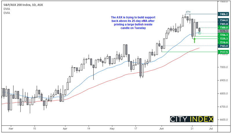本文来自于嘉盛集团特别供稿,外汇及CFD交易可能会为您的投资带来机会与风险。 上周对AX200指数而言又是具里程碑意义的一周,指数交投攻向历史新高,当周收高0.8%于7368.9,今年迄今涨幅也因此达到令人惊叹的13.6%。 而本周基调急转而下。AX200指数目前交投下跌,报7232.5,回吐6月3.5%涨幅中的很大一部分。 市场此番