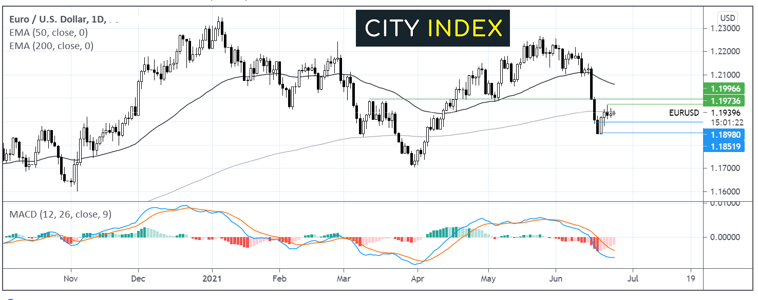 本文来自于嘉盛集团特别供稿,外汇及CFD交易可能会为您的投资带来机会与风险。 欧元/美元聚焦欧洲央行行长拉加德 欧元/美元正自上周五低点回升。上周美联储FOC会议意外偏鹰,委员布拉德表示2020年或需加息且缩表讨论已经启动,受此影响,欧元/美元上周五探入两个半月低点。 随着美债殖利率走弱,货币对周一回升看向1.