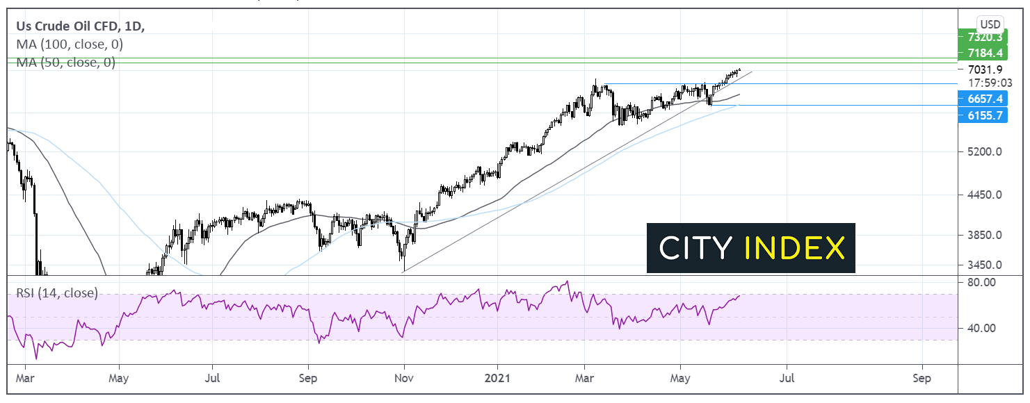本文来自于嘉盛集团特别供稿,外汇及CFD交易可能会为您的投资带来机会与风险。 西得州原油触及70 油价在西方国家需求强劲的信号中上涨。美国和欧洲成功接种疫苗以及夏季驾车出游季的到来,提升需求期待。 ToTo的数据显示,欧洲15个城市的交通繁忙水平创下疫情爆发以来的最高峰。 与此同时,伊朗重新向市场供应原油的