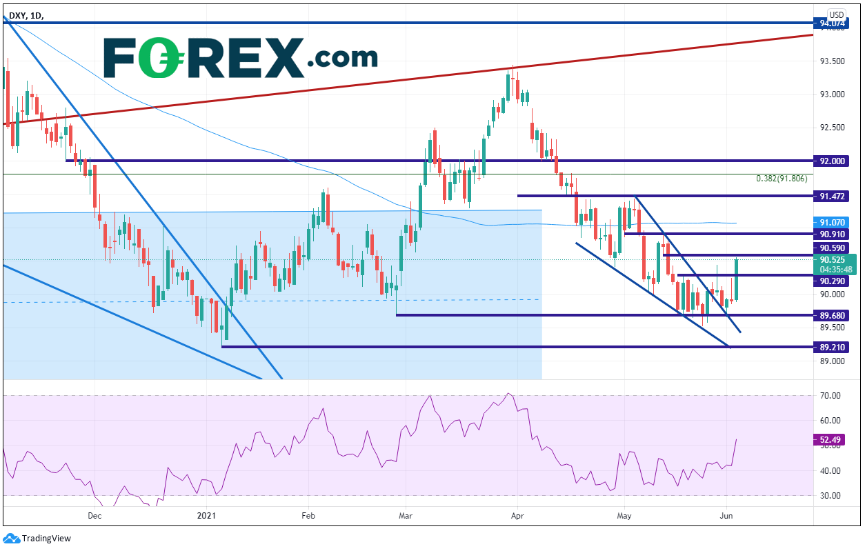 本文来自于嘉盛集团特别供稿,外汇及CFD交易可能会为您的投资带来机会与风险。 美元指数周四大涨。美国时段开盘,因为俄罗斯宣布将清仓其主权财富基金中的美元,美元遭到抛售。但美元指数之后逆转,因好于预期的5月AD就业人数变化报告和好于预期的5月29日当周初请失业金人数而实现华丽转身。对于将在周五发布的非农就业