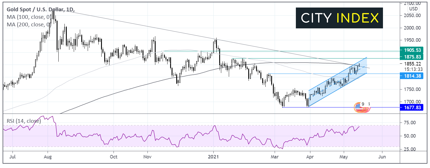 本文来自于嘉盛集团特别供稿,外汇及CFD交易可能会为您的投资带来机会与风险。 黄金升穿关键阻力位 黄金正交投于3个月高点上方,上穿1850美元价位。 因美国零售数据疲弱加之美联储重引鸽派言论,美债殖利率连续第三天下跌,贵金属价格提振。 地缘政治相关头条及对亚太地区新冠疫情再度抬头的担忧令金价获撑。 在监