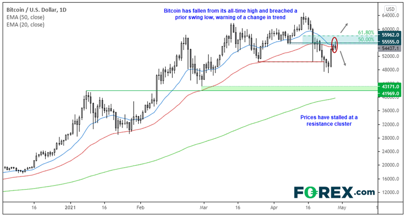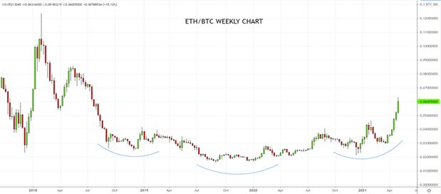 本文来自于嘉盛集团特别供稿,外汇及CFD交易可能会为您的投资带来机会与风险。 继2021年一季度强力反弹后,比特币4月中旬以来下挫27.5%,而以太坊同步反弹15%左右。交易员的关注重点因此从比特币转向以太坊。 而一张呈现比特币下跌相对以太坊上涨形成的反差图近期成为Twittr上最受欢迎图表之一也是上述结论的明证。人