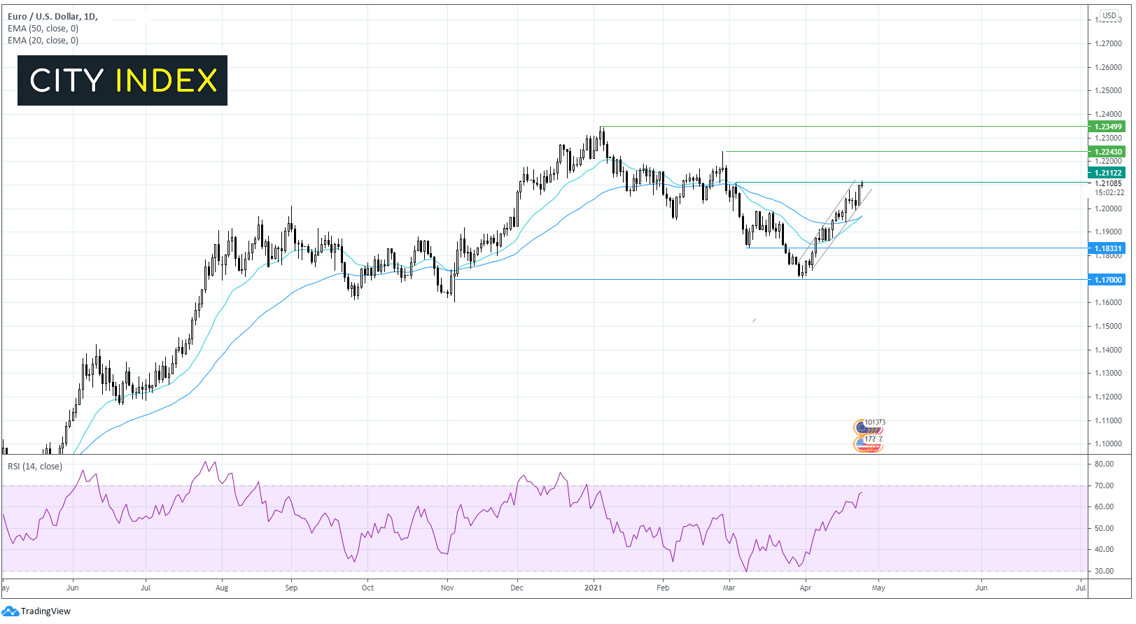 本文来自于嘉盛集团特别供稿,外汇及CFD交易可能会为您的投资带来机会与风险。 在德国IFO商业景气指数公布之前,欧元/美元守住1.21 欧元/美元新的一周开局小幅上涨,反弹至2个月最高点。 疫苗接种加速推进改善了欧元区的前景,并帮助改善人气。有关欧元区将欢迎美国游客入境的消息正在提振欧元。 美元跌至3月以来最