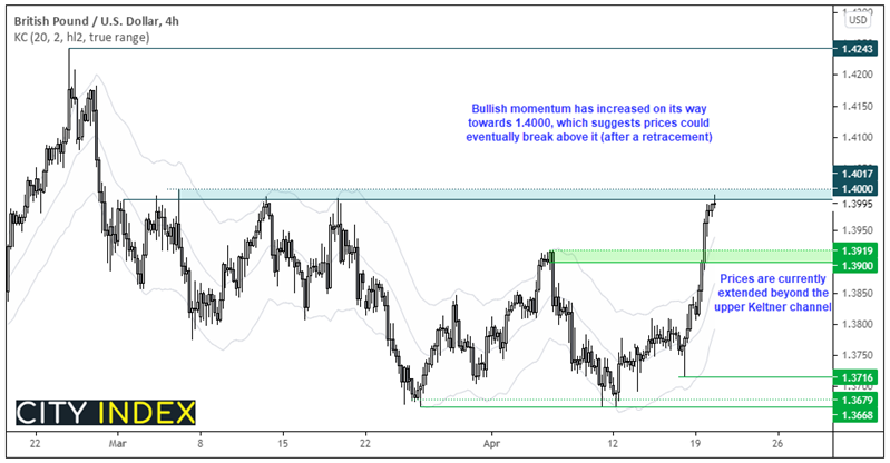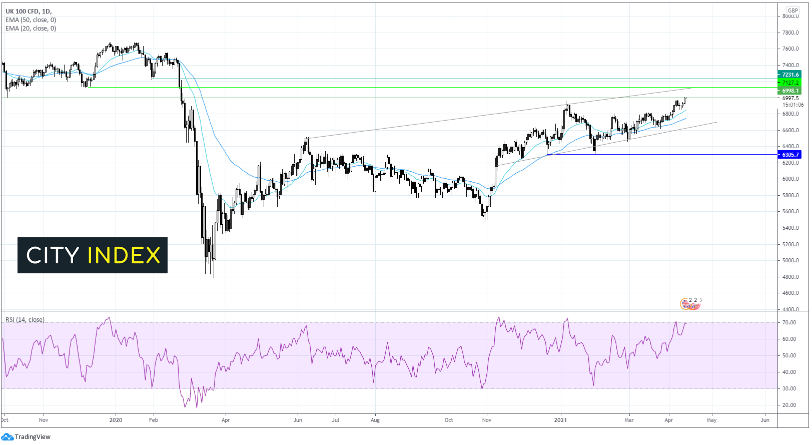 本文来自于嘉盛集团特别供稿,外汇及CFD交易可能会为您的投资带来机会与风险。 FT在乐观的中国GD数据发布之后摸至7000点 受到经济活动重启的乐观情绪与走弱的英镑所提振,FT最近几周一直在冲高。 英镑走弱推高由跨国公司成份股组成的FT指数。 英国新冠病毒病例数继续下降并减少封锁管控,这提振了FT中业务更集中于国