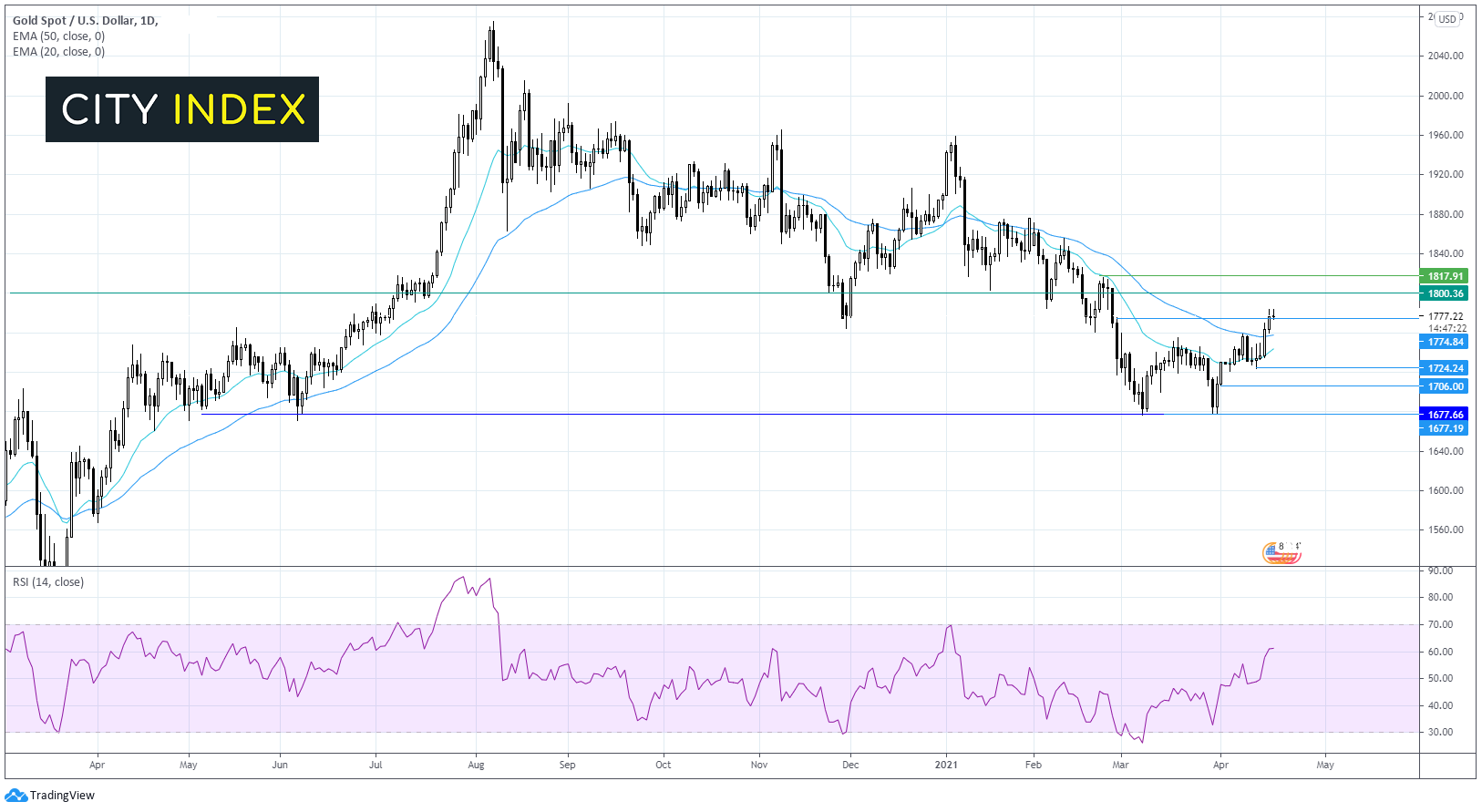 本文来自于嘉盛集团特别供稿,外汇及CFD交易可能会为您的投资带来机会与风险。 黄金构筑双底形态 金价上周连续第二周录得上涨,触及两月高点1784美元/盎司。 由于中国央行允许国内和国际商业银行进口大量黄金以满足国内需求,同时美债殖利率持续疲软,无收益黄金资产需求提振。 人们对拜登总统基础设施计划的担忧升