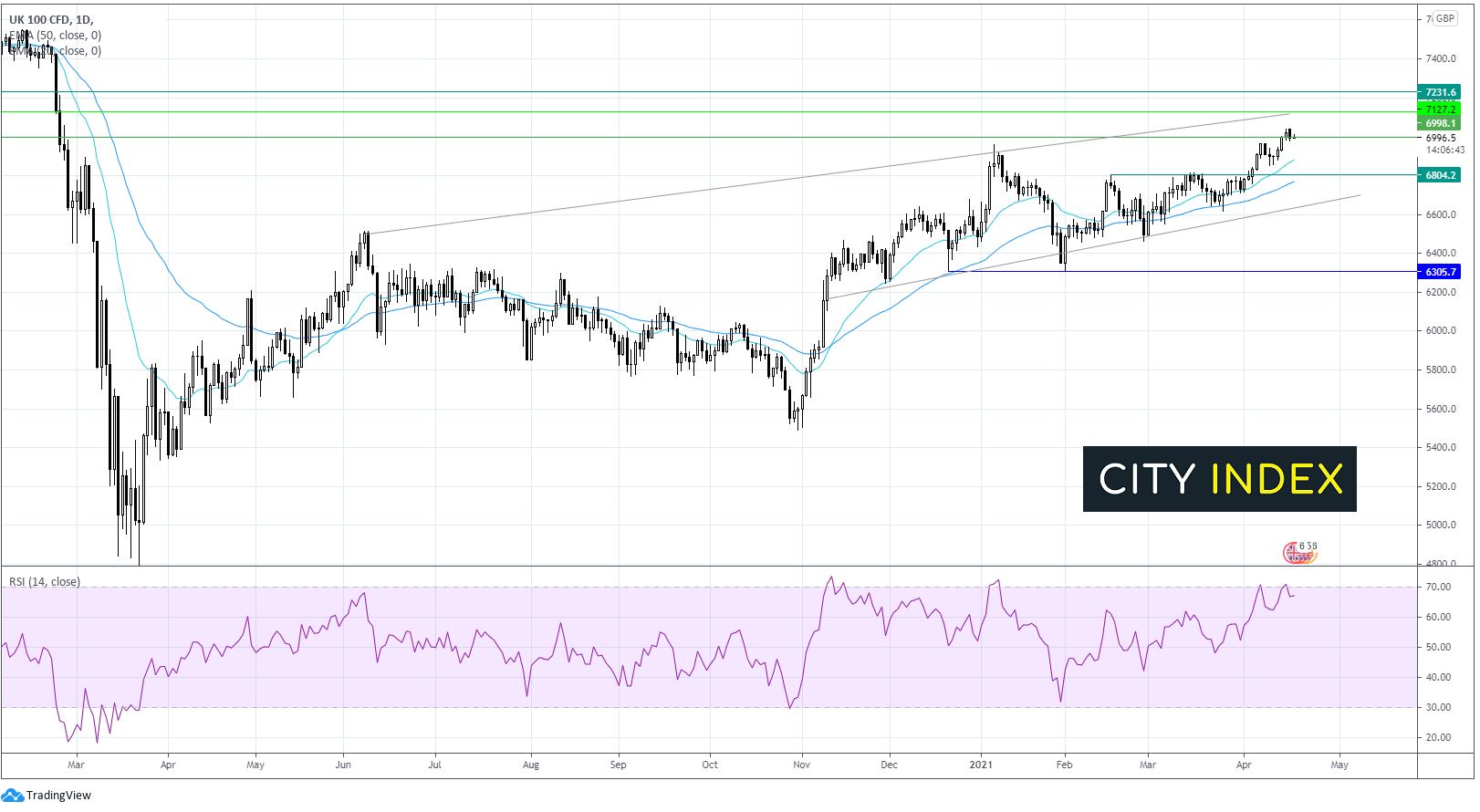本文来自于嘉盛集团特别供稿,外汇及CFD交易可能会为您的投资带来机会与风险。 英国就业数据公布,英镑应声上涨,富时指数走势不及其他股指 富时指数上周表现强劲,录得逾1.7%涨幅,自疫情爆发以来首次升穿7000点。 英镑/美元走强意味着富时指数相对于其他指数表现滞后。 英国失业率意外自5%降至4.9%,优于预期的5.1