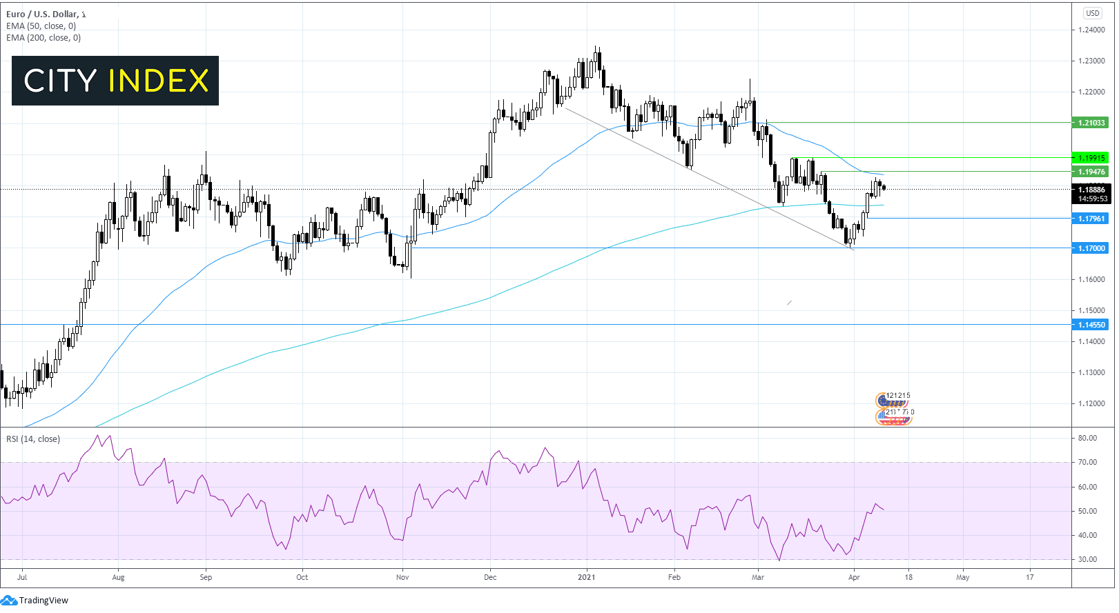 本文来自于嘉盛集团特别供稿,外汇及CFD交易可能会为您的投资带来机会与风险。 欧元/美元走弱,等待欧元区零售销售报告 受美元反弹的影响,欧元/美元承压下跌 美联储主席鲍威尔有关美国经济复苏的乐观评论,加上降温的冒险情绪,令美元上扬。 欧元区零售销售报告将要发布,市场预测2月月率上涨1%。前值为下降5.7%。