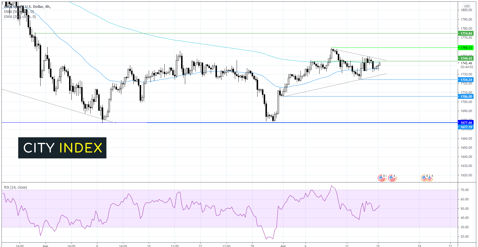 本文来自于嘉盛集团特别供稿,外汇及CFD交易可能会为您的投资带来机会与风险。 黄金期待美国零售销售给出更多指引 黄金周四小幅上涨,收复昨天失地,当时黄金未能在美元走弱时趁势上涨。 此贵金属交投于相似的区间内,等待美国零售销售报告给予突破动力。 对3月零售销售的预期值为从2月的下降3.5%转而跃升6.3%。 黄