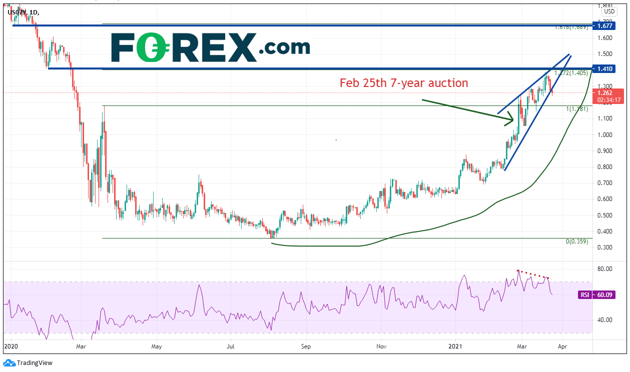 本文来自于嘉盛集团特别供稿,外汇及CFD交易可能会为您的投资带来机会与风险。 事件:美国7年期国债拍卖 时间:周四(2021年3月25日)下午1:00 为何关注:还记得2月25日的7年期债券拍卖吗?当时买需低迷:竞买率为2.045,是史上最低点。另外,间接购买比率降至38.06%。间接买盘通常用作判断国际需求的指标。间接竞买