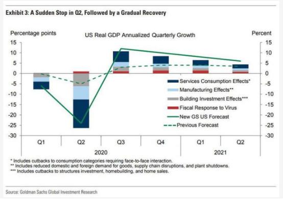 为什么呢?美国经济今年衰退成为定局。高盛3月20日预测,2020年第一季度的季度化年增长率为-6%,第二季度为-24%,第三季度为+12%,第四季度为+10%,全年平均增长率为-3.8%。明年第一季度和第二季度,增速仍继续放缓。目前经济的估算仍有很大的不确定性,特别是明年的情况。很多假设是基于疫情控制的情况。如图。