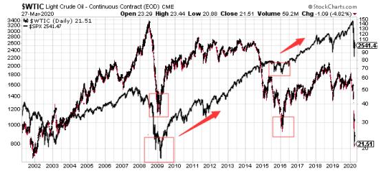 原油被称为工业的血液,和全球经济的景气程度高度同步。具体量化方面,可以参考美股。美股见底和原油见底时间,是高度同步,特别是见大底的时间。见下图。标普500指数见底,原油见底。或者说,美股没有形成底部,原油不可能形成大底。