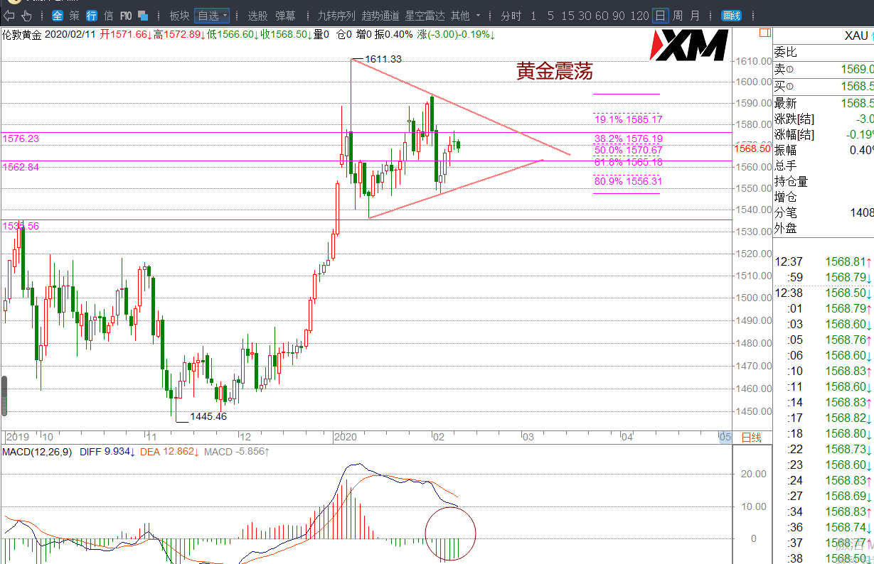 (2)黄金宽幅运行关注1585/1588-1556/1551区域的运行。