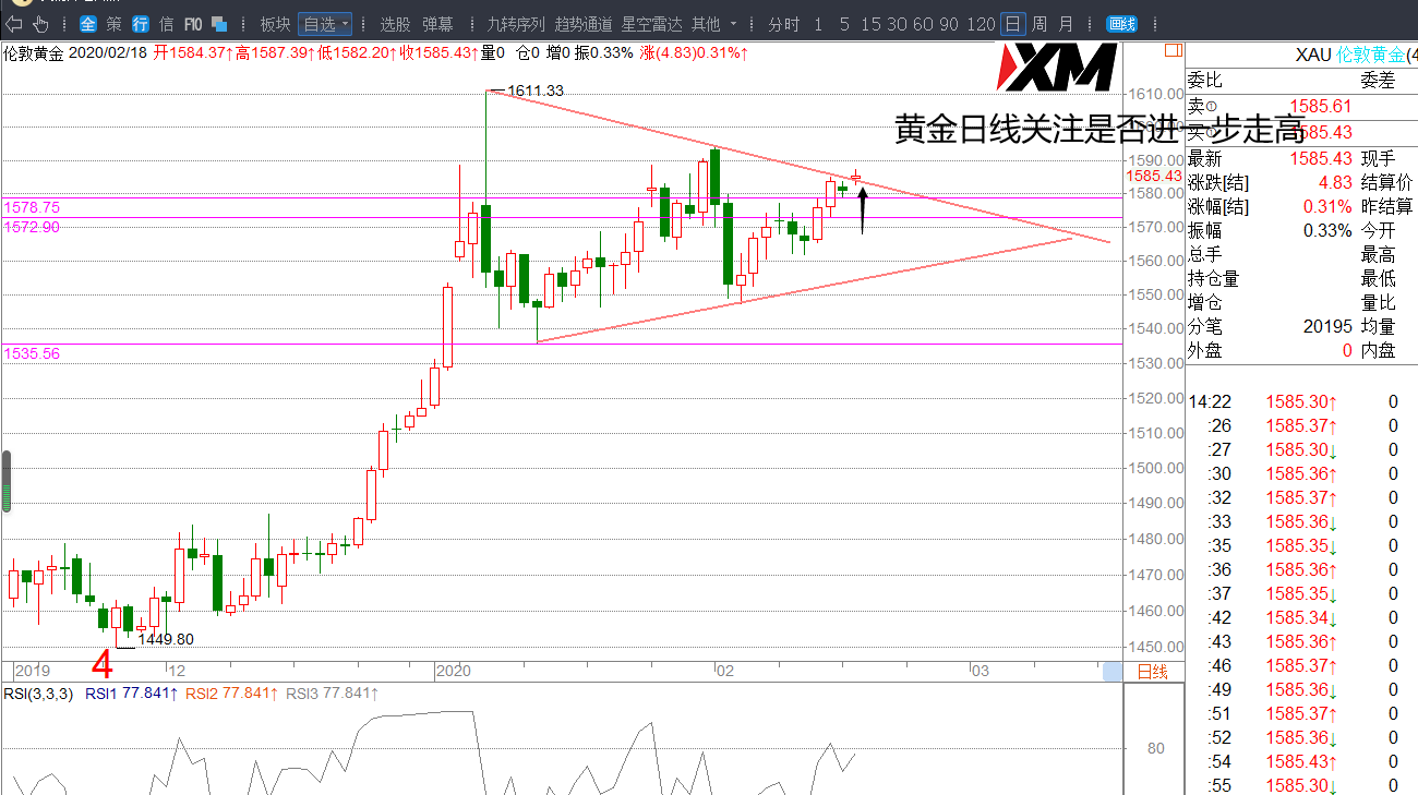 (2)黄金今天若在1587高点压制受阻,日内下破1578,或将继续走回三角形运行,黄金会往1573-1571一带下跌。