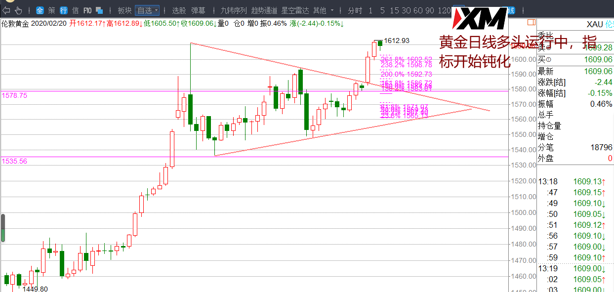 昨日走惯性上涨走势,日线已经新高,1599上方日内保持单边多头运行。
