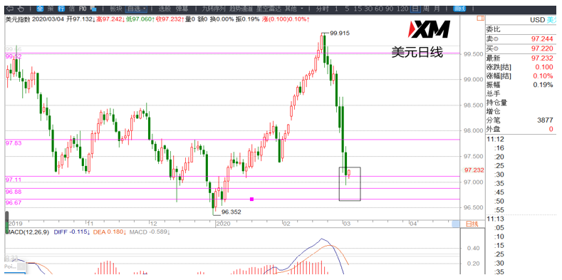 (1)美元在97.70下方,如果反弹在97.53一带依然关注高空机会,止损97.73,目标97.30-97.10