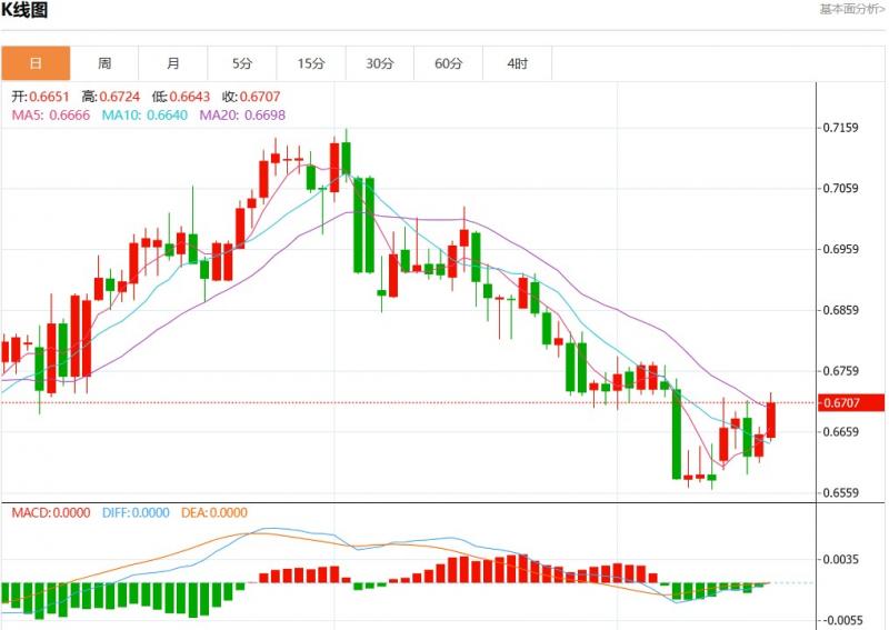 周五盘中,澳元美元报0.6707,涨幅0.80%。