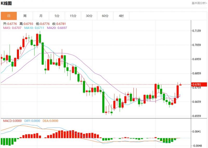周五盘中,澳元美元报0.6781,涨幅0.09%。