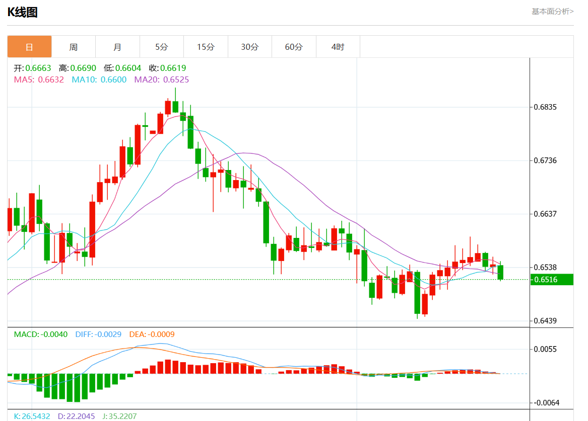 周三盘中,澳元/美元报0.6515,跌幅0.43%。